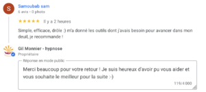 Il m’a tout de suite mise en confiance et je le recommande a tous ceux qui ont besoin d’un coach mental hypnologue et sophrologue que ce soit pour vouloir arrêter de fumer, perdre du poids, douleur, phobies, stress, burn out, etc…